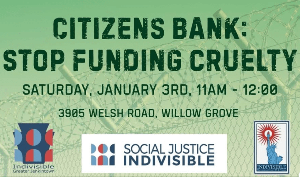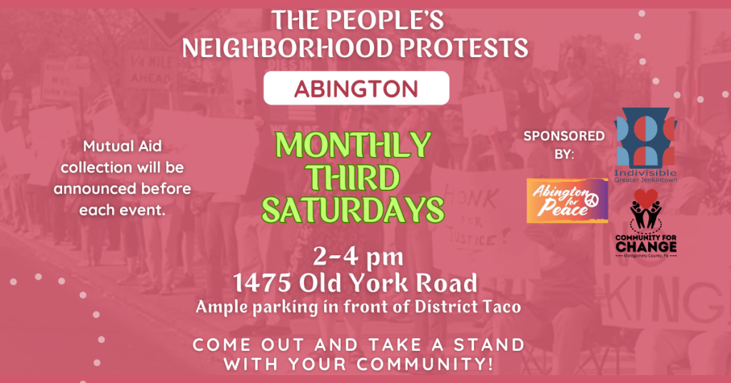 Our monthly Abington protests are held on the 3rd Saturday of the month, 2-4 pm, on Old York Road in front of the Target / District Taco shopping center.