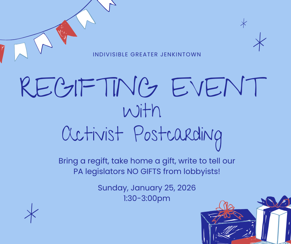 JOIN Indivisible Greater Jenkintown for a totally free, fun afternoon of Regifting, shopping, and activist postcarding.