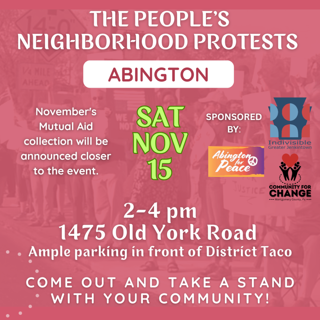 Starting in November, our monthly Abington protests will be held on the 3rd Saturday of the month, 2-4 pm, at the same location on Old York Road in front of the Target / District Taco shopping center.
