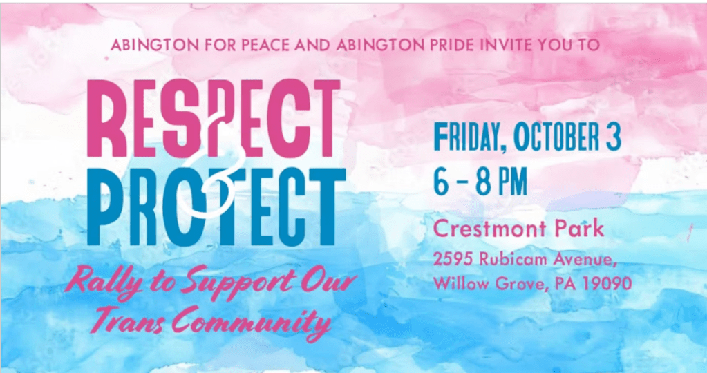 Save the date! Friday, October 3rd from 6-8pm at Crestmont Park, we invite our community, surrounding neighborhoods, trans and gender diverse people and their allies to join Abington for Peace & Abington Pride as we rally around the trans community.